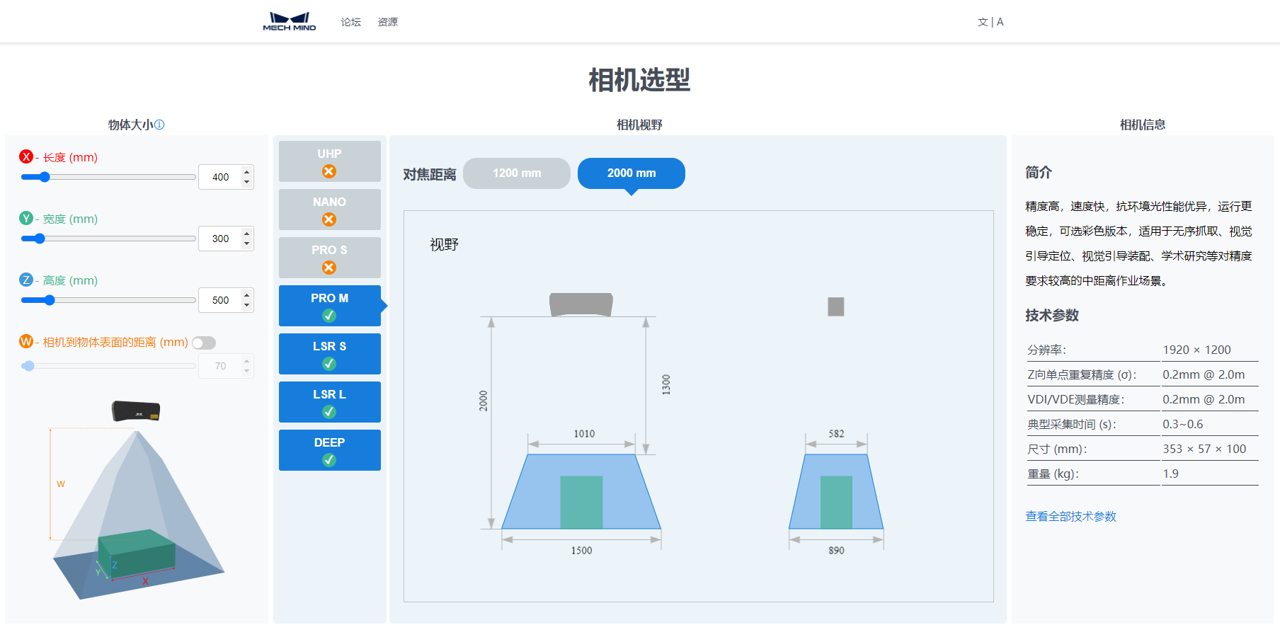 梅卡曼德3D相机选型网页已上线社区,支持根据物体大小自动筛选出合适的相机型号,让3D相机选型更方便和准确!