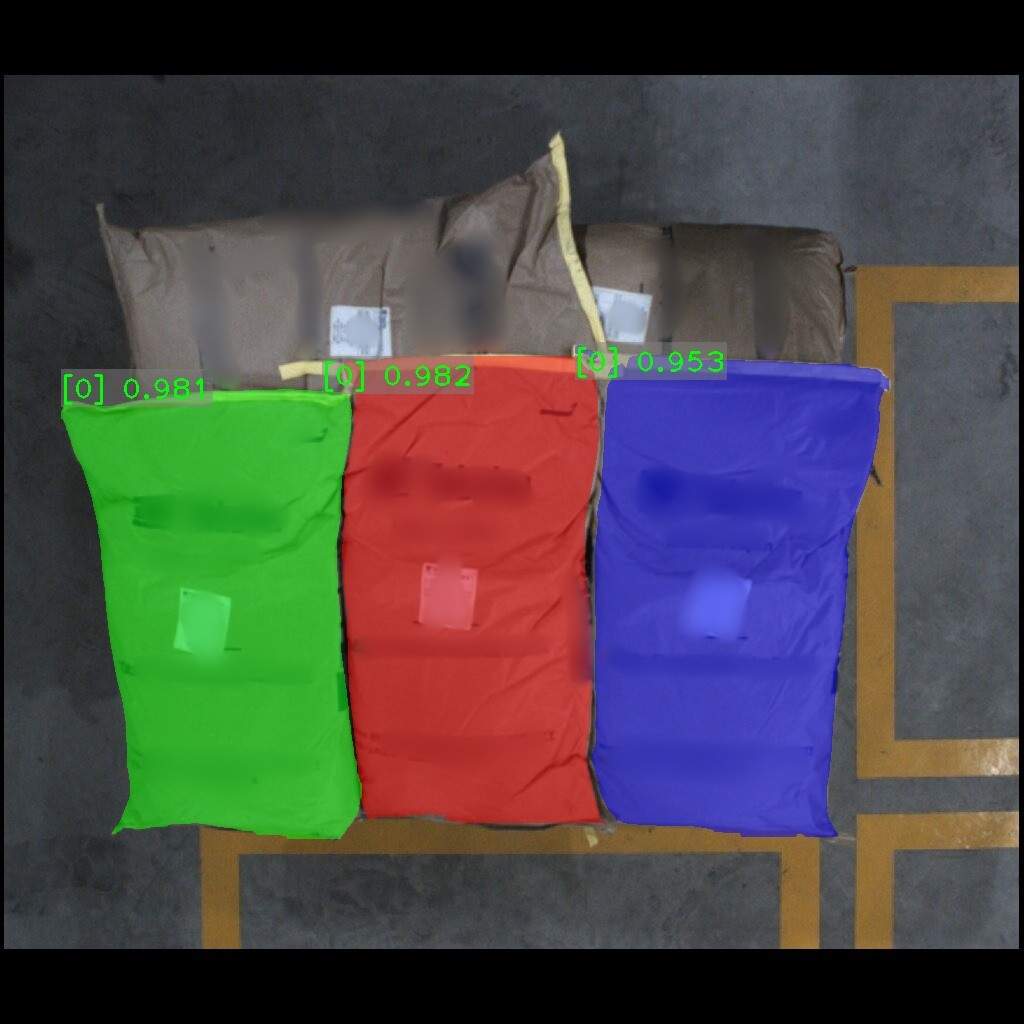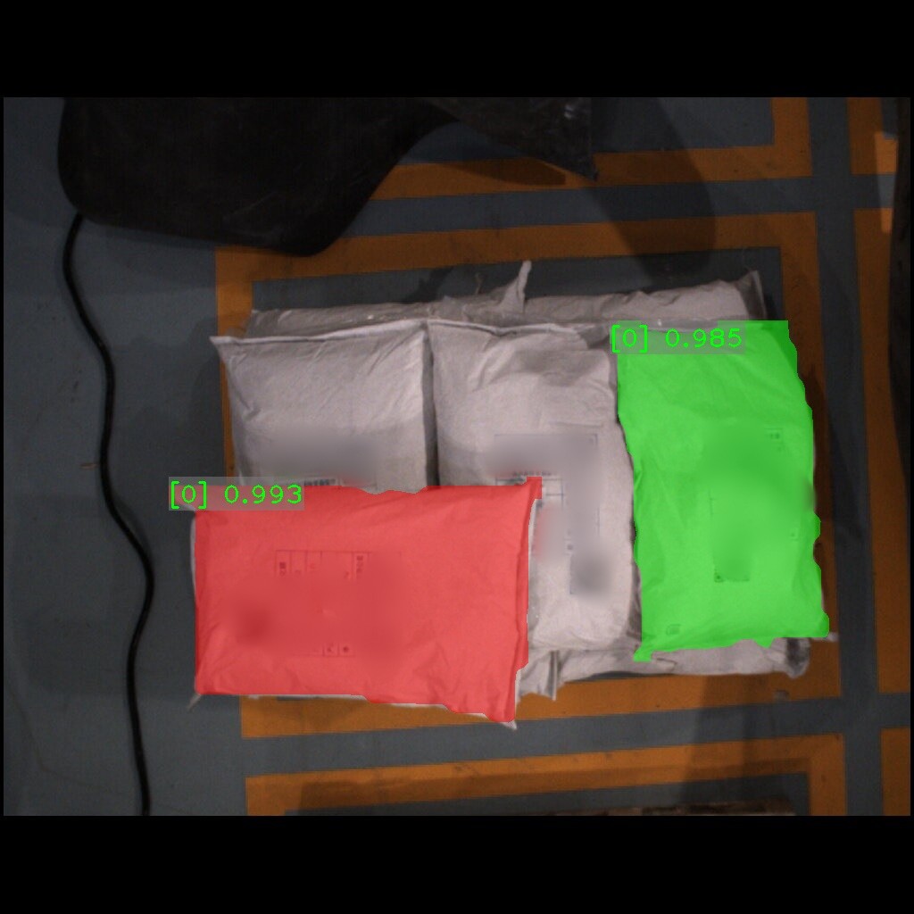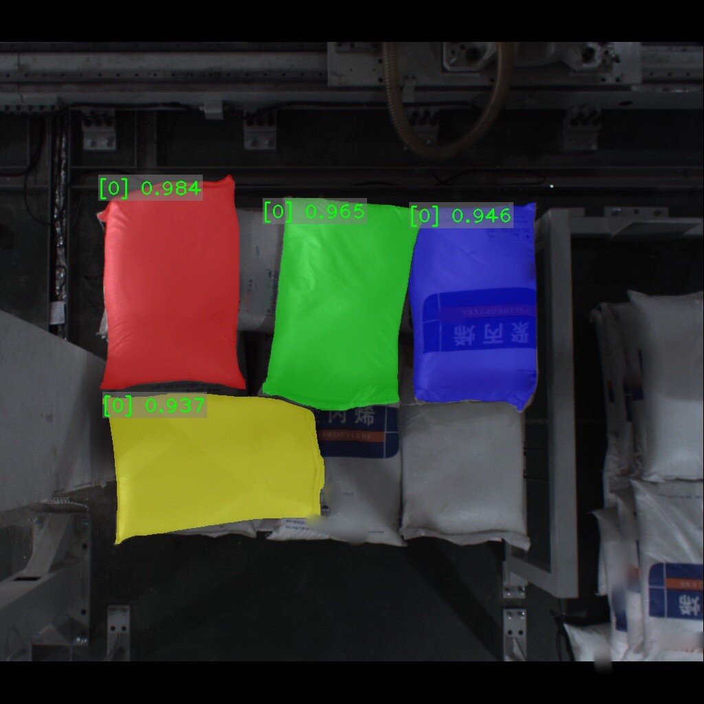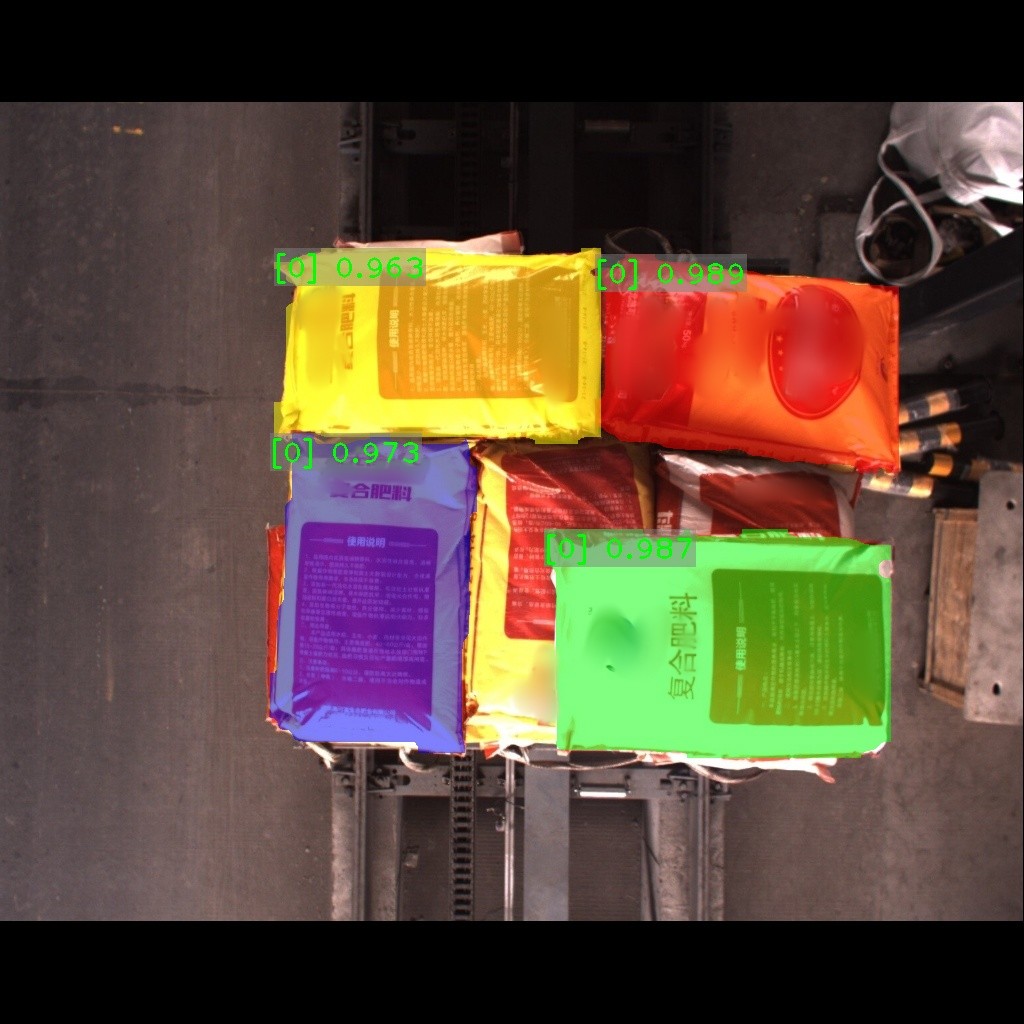 麻袋识别效果如下表所示(可点击查看大图)。图中数字为置信度,即识别表现评分。彩色掩膜边缘轮廓即识别出的麻袋边缘轮廓。麻袋识别结果的边缘轮廓可达到较高贴合度。
