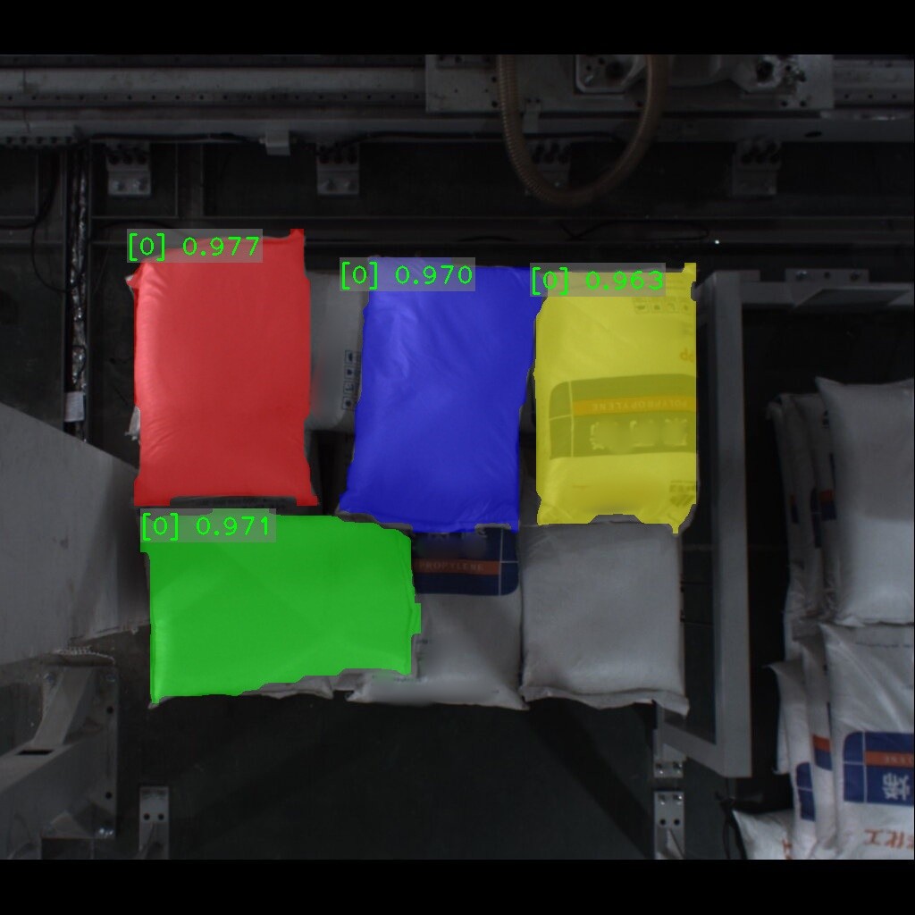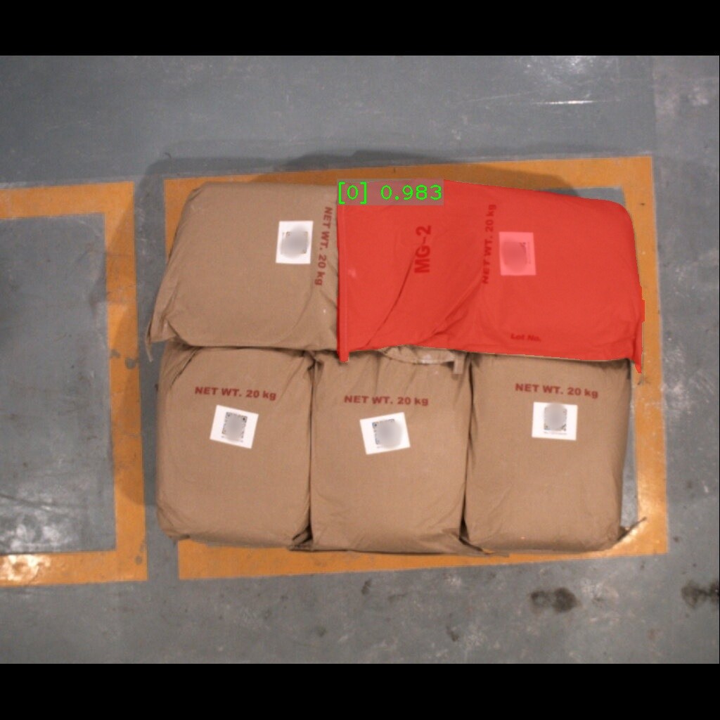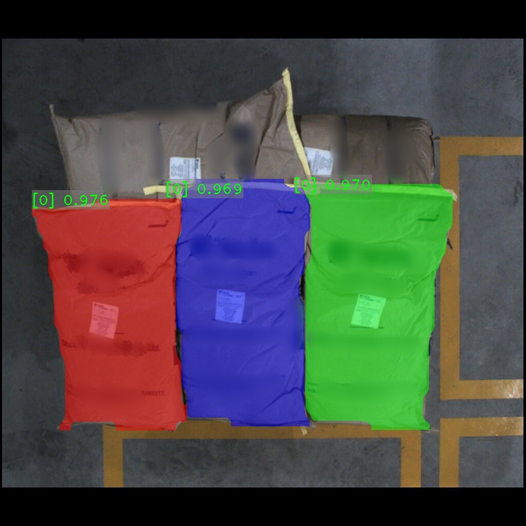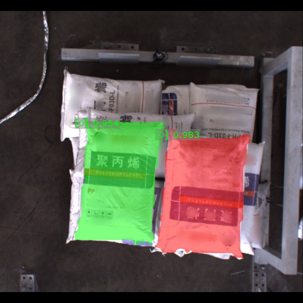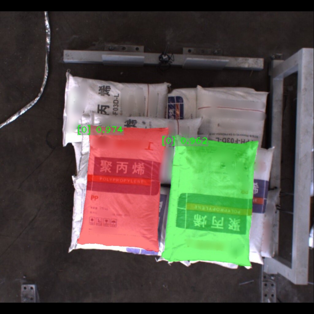 麻袋识别效果如下表所示(可点击查看大图)。图中数字为置信度,即识别表现评分。彩色掩膜边缘轮廓即识别出的麻袋边缘轮廓。麻袋识别结果的边缘轮廓可达到较高贴合度。
