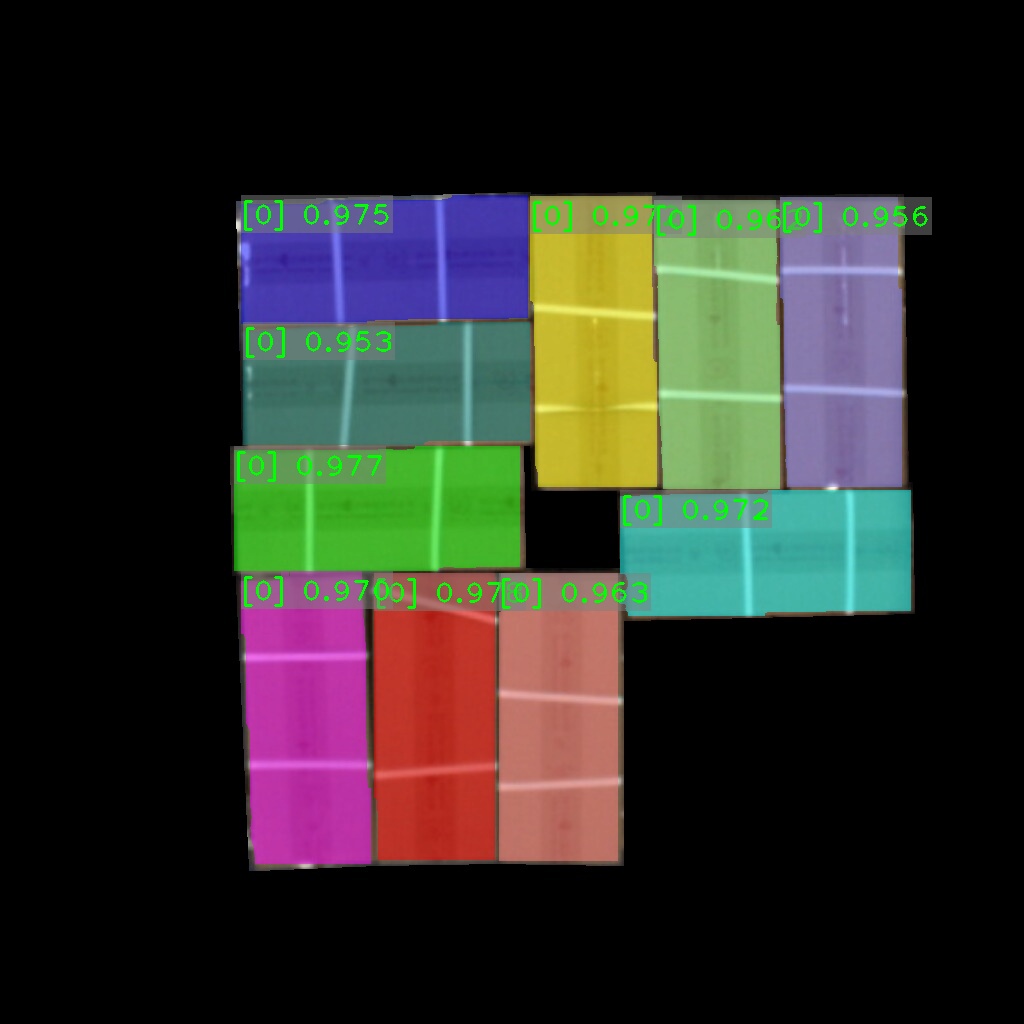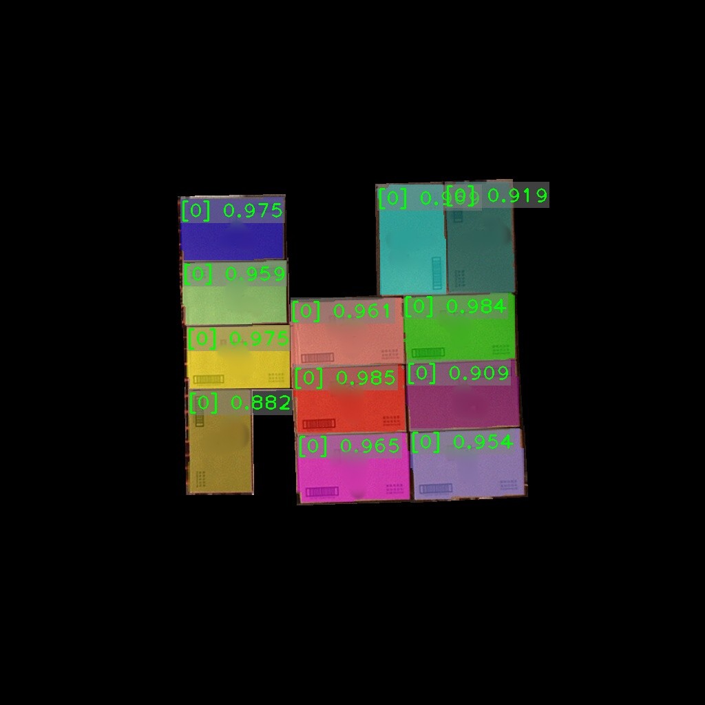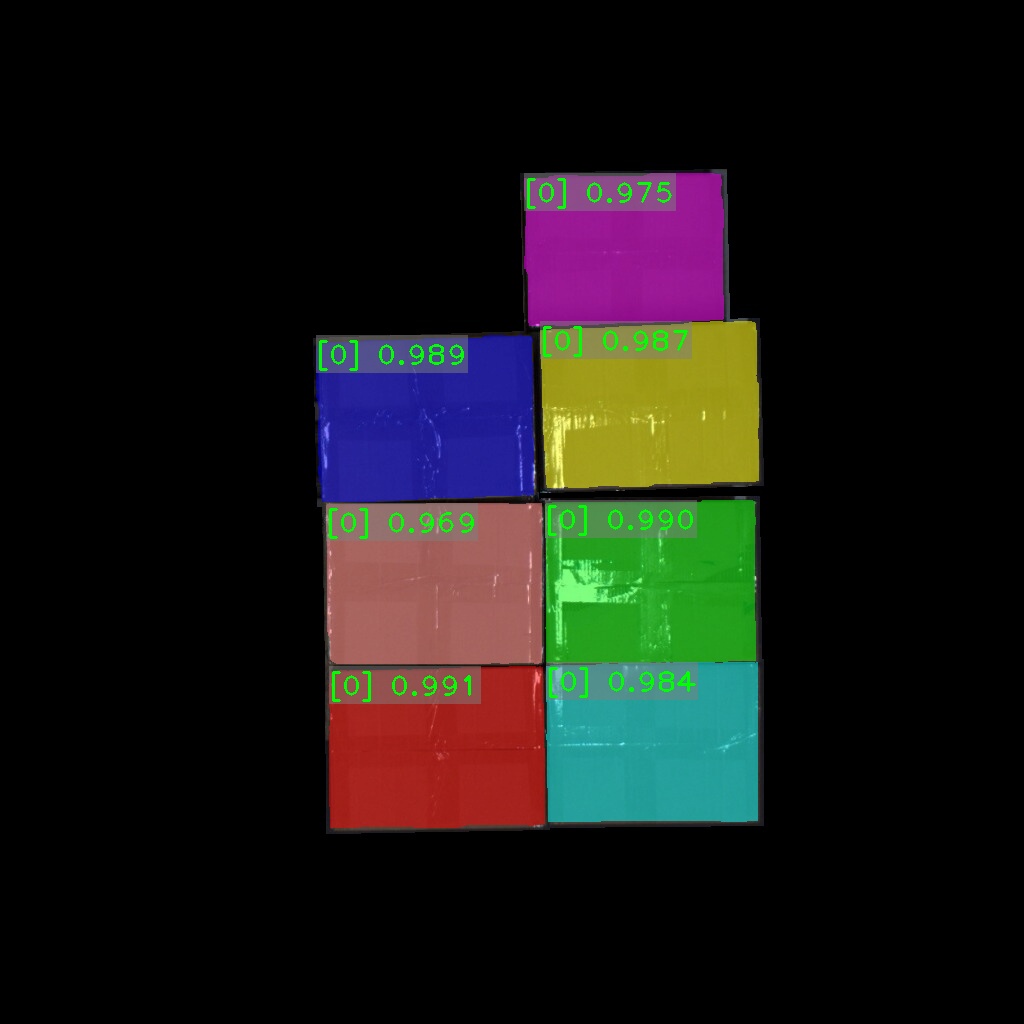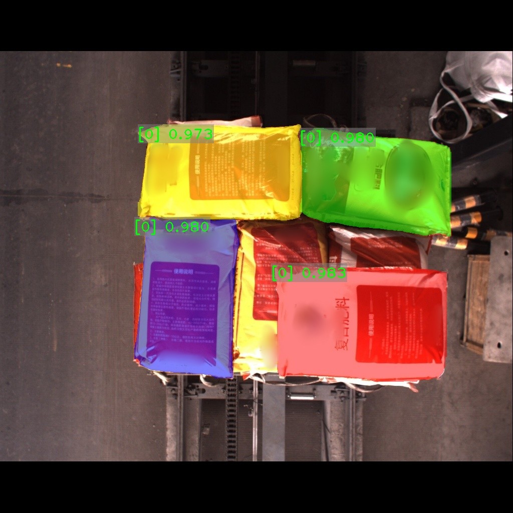 纸箱识别效果如下表所示(可点击查看大图)。图中数字为置信度,即识别表现评分。彩色掩膜边缘轮廓即识别出的纸箱边缘轮廓。纸箱识别结果的边缘轮廓可达到较高贴合度。