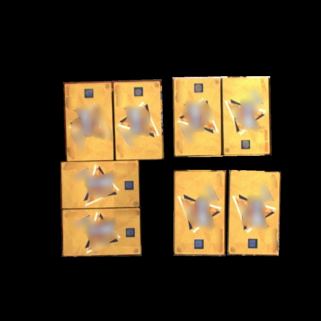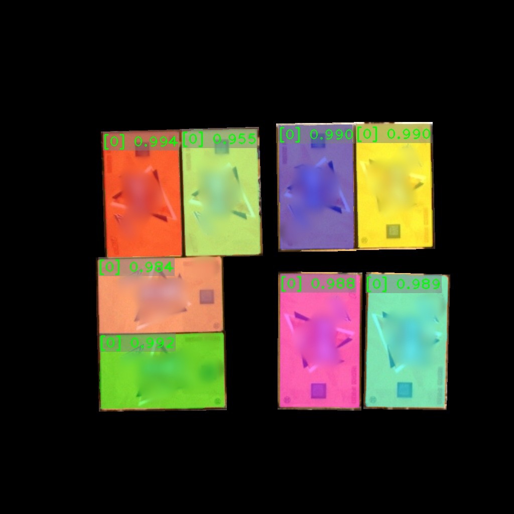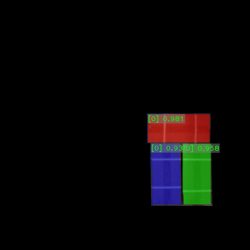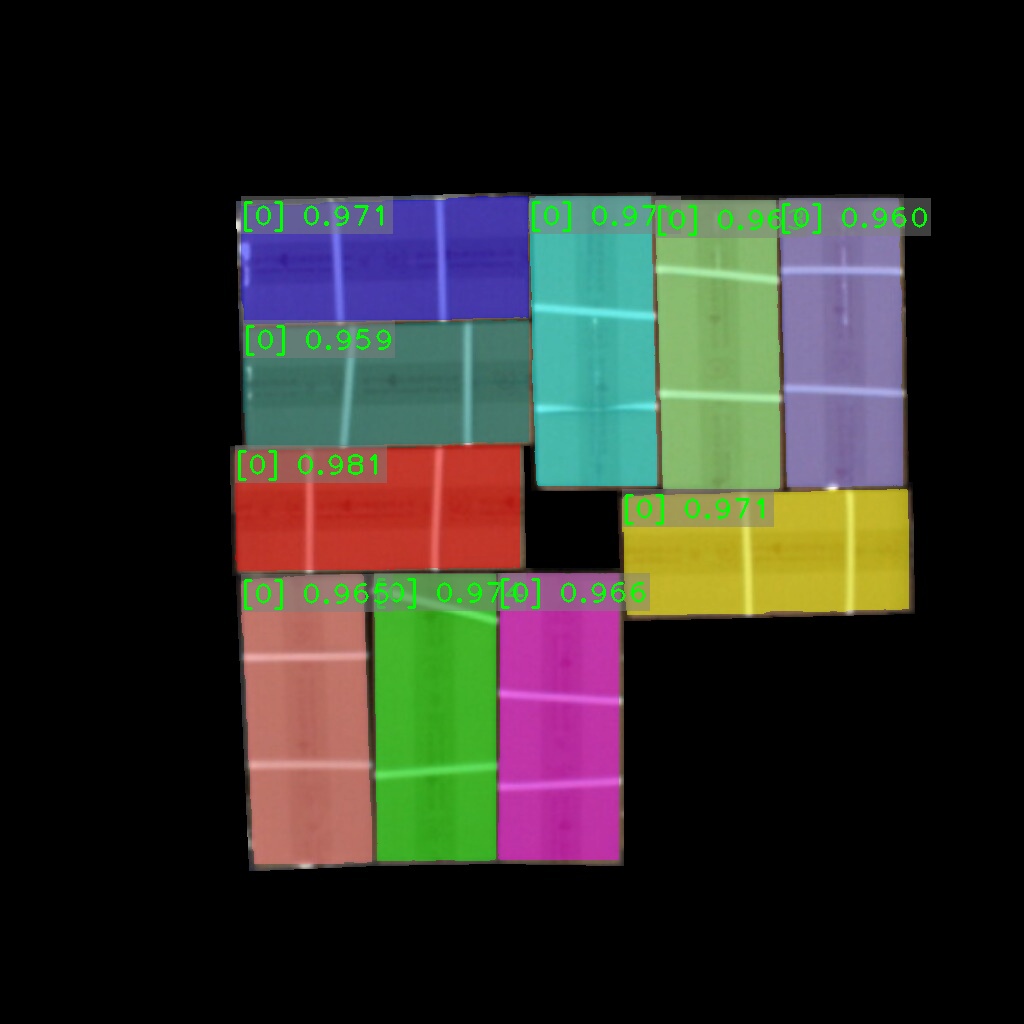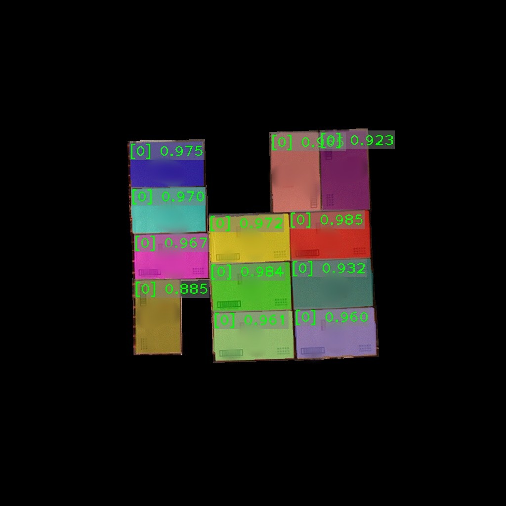 纸箱识别效果如下表所示(可点击查看大图)。图中数字为置信度,即识别表现评分。彩色掩膜边缘轮廓即识别出的纸箱边缘轮廓。纸箱识别结果的边缘轮廓可达到较高贴合度。